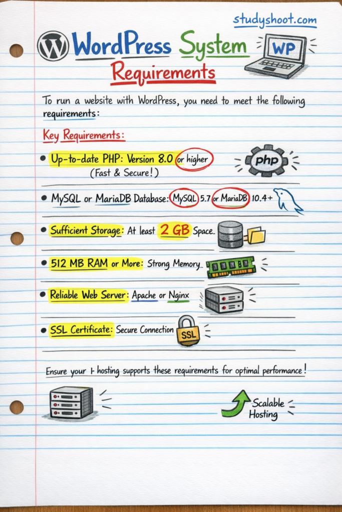 يحتاج ووردبريس إلى PHP 8.0 على الأقل، MySQL 5.7 أو MariaDB 10.4، ومساحة تخزين لا تقل عن 2 غيغابايت.