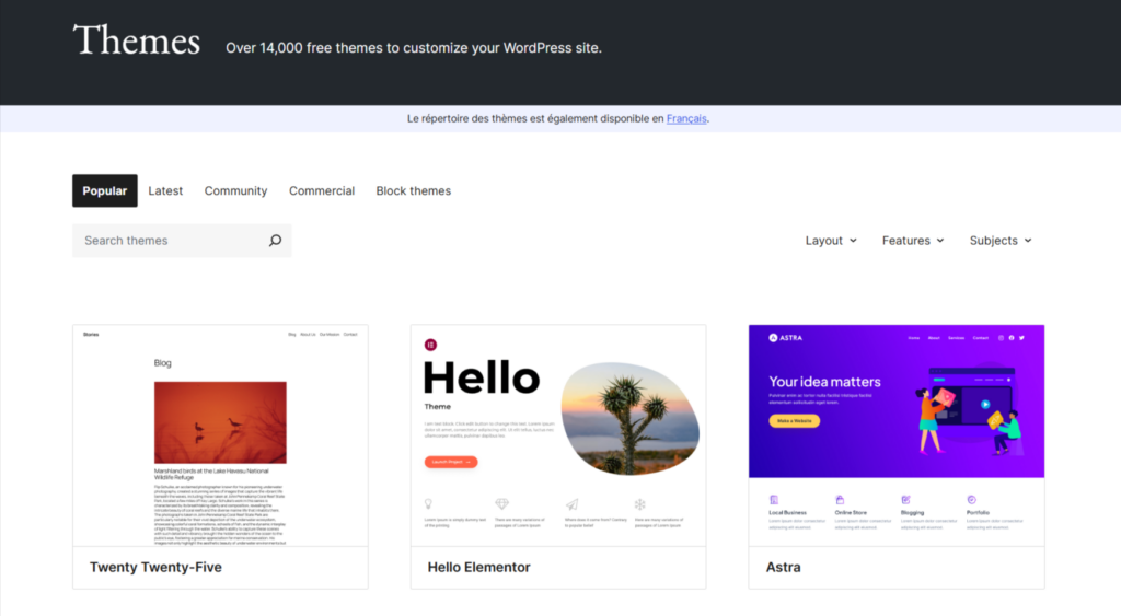 - هناك قوالب مجانية يمكن تنزيلها مباشرة من مكتبة ووردبريس الرسمية.